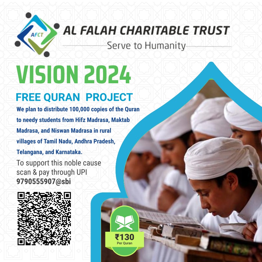 We plan to distribute 100,000 copies of the Quran to needy students from Hifz Madrasa, Maktab Madrasa, and Niswan Madrasa in rural villages of Tamil Nadu, Andhra Pradesh, Telangana, and Karnataka.