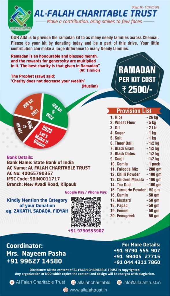 Our aim is to provide the ramadan kit to as many needy families across Chennai